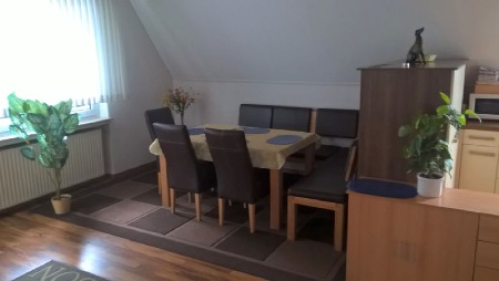 Der Wohn-Eßzimmer-Bereich ist sehr großzügig gestaltet, und es seht Ihnen ein 46 Zoll Fernseher mit Anmeldung zu Netflix und Amazone Prime, sowie Satelliten TV zur Verfügung.