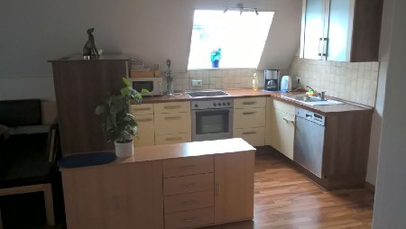 Ein Teil der Einbauküche dient als Raumteiler, die Einbauküche ist vollständig eingerichtet (Spülmaschine, Herd mit Ceranfeld, Backofen, Mikrowelle, Wasserkocher, Kaffeemaschine, etc.).