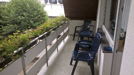 Der große und überdachte Balkon mit Blick auf den Garten lädt gern zum Verweilen ein.