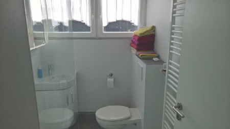 Das Badezimmer bietet WC und Dusche.